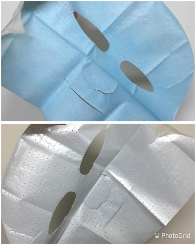 取下白色珍珠膜後,將藍色色層朝外,面膜服貼與臉上後下藍色層