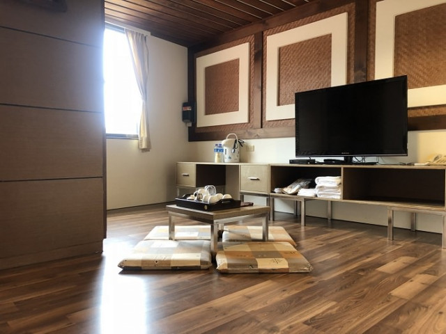 全家一起在小茶桌前看電視聊天還有老街買的小點心,