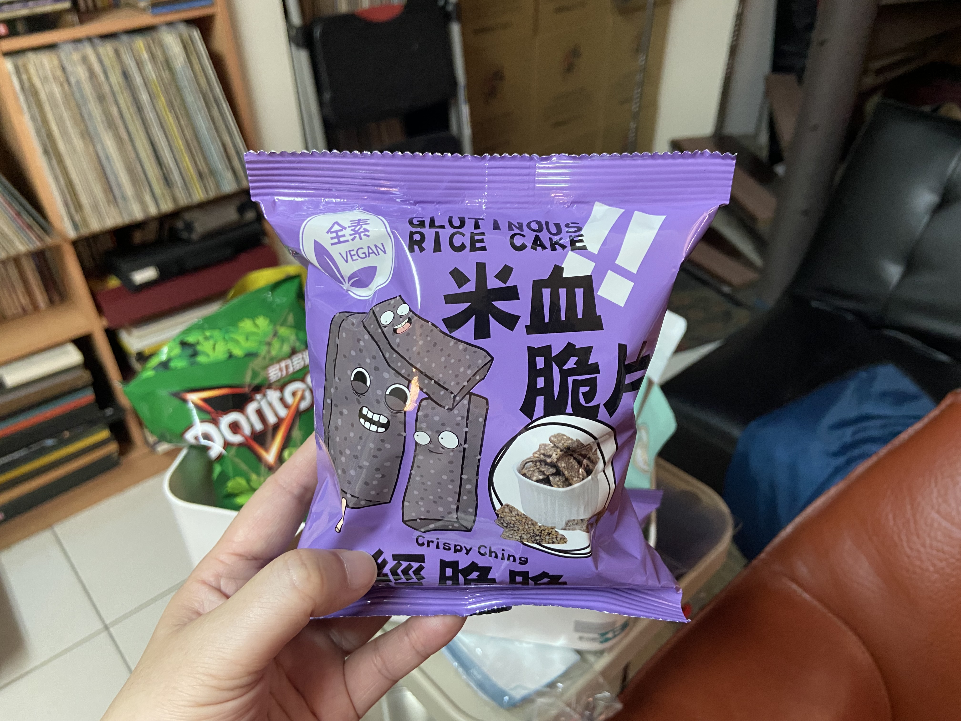 吃了一個就覺得這個脆片很可以,雖然是純素的,但是完全沒有素食食品那種「菜」味,而且這米血口感脆到不可思議,完全不油膩,酥脆的滋味讓人吃到停不下來,另外餅乾上面因為裹上一層薄薄的白胡椒粉,所以有點微辣,配上辣辣的氣泡水或是可樂、沙士那些應該很對味。