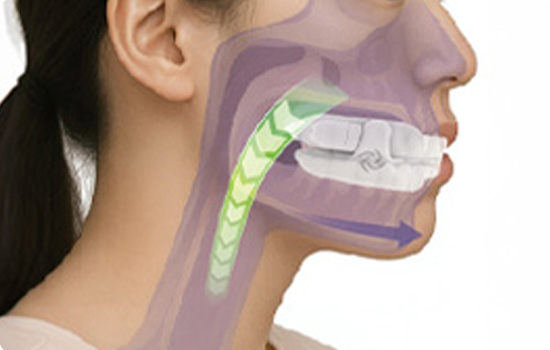 將下顎和舌頭往前固定, 避免舌根後墜→ 咽喉後方的空間變大 → 減少氣道阻力,減少呼吸中止事件