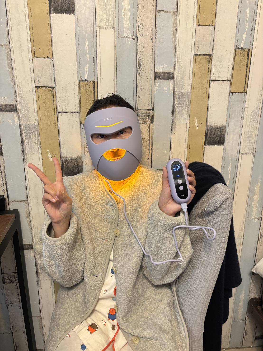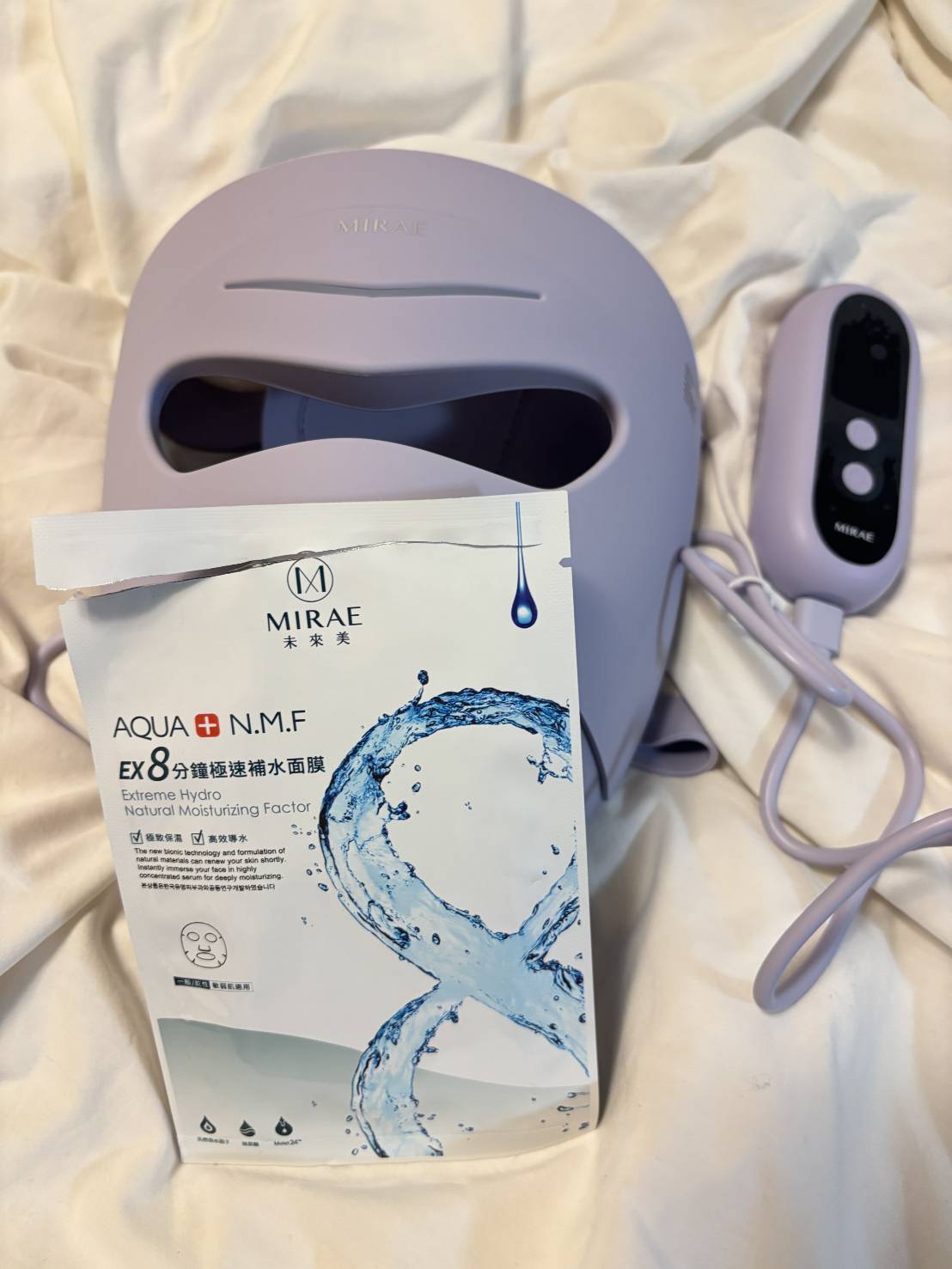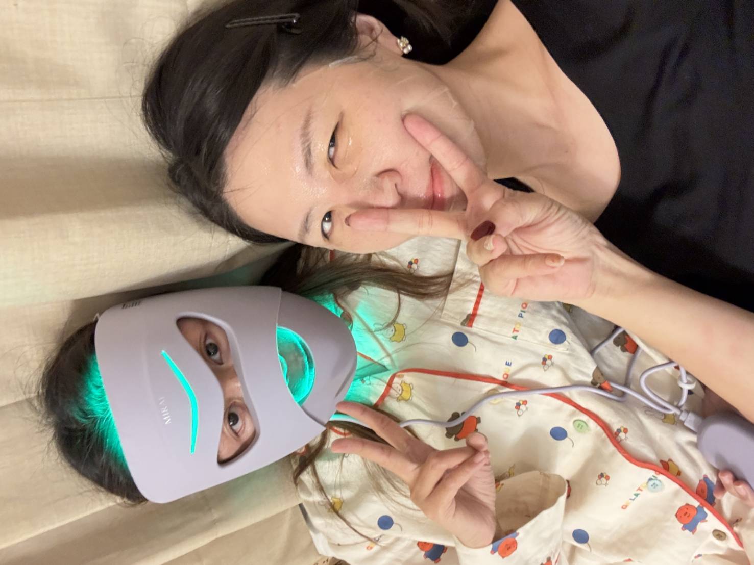 這趟回家我也是帶了很多面膜、保養品試用包小樣等與她分享。畢竟今年過年我不在家,得需要靠她幫忙扛場面。我帶了很「蝦趴」的光面罩回去,兩個女人躺在床上,一起敷面膜,敷完面膜就帶起面罩來照光。這台光面罩照一次只需要八分鐘,兩個人輪流照,有夠可愛😍